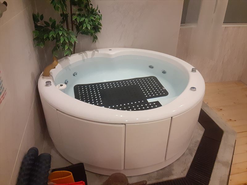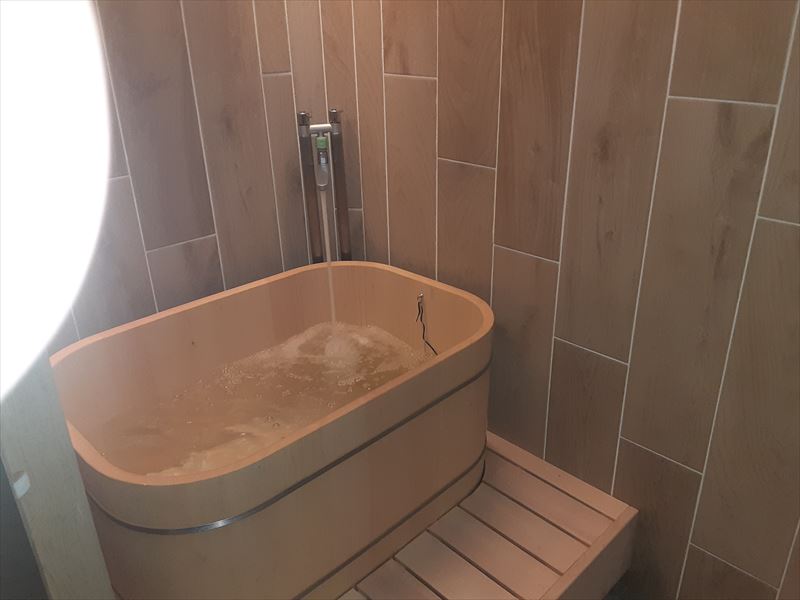 水風呂コーナー とても高級感のある浴槽です。ジェットバス完備。水風呂だけでなく温かいジェットバスも楽しめます。↓